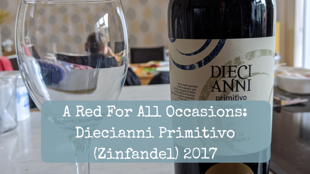 I have a bit of a chequered history with red wine. Something about the majority of red wines sends me into a sleepy state, from which there is generally no return! Sarah on the other hand loves them, so I was very much reliant on her views this time around, as we were looking at the Diecianni Primitivo (Zinfandel) 2017.